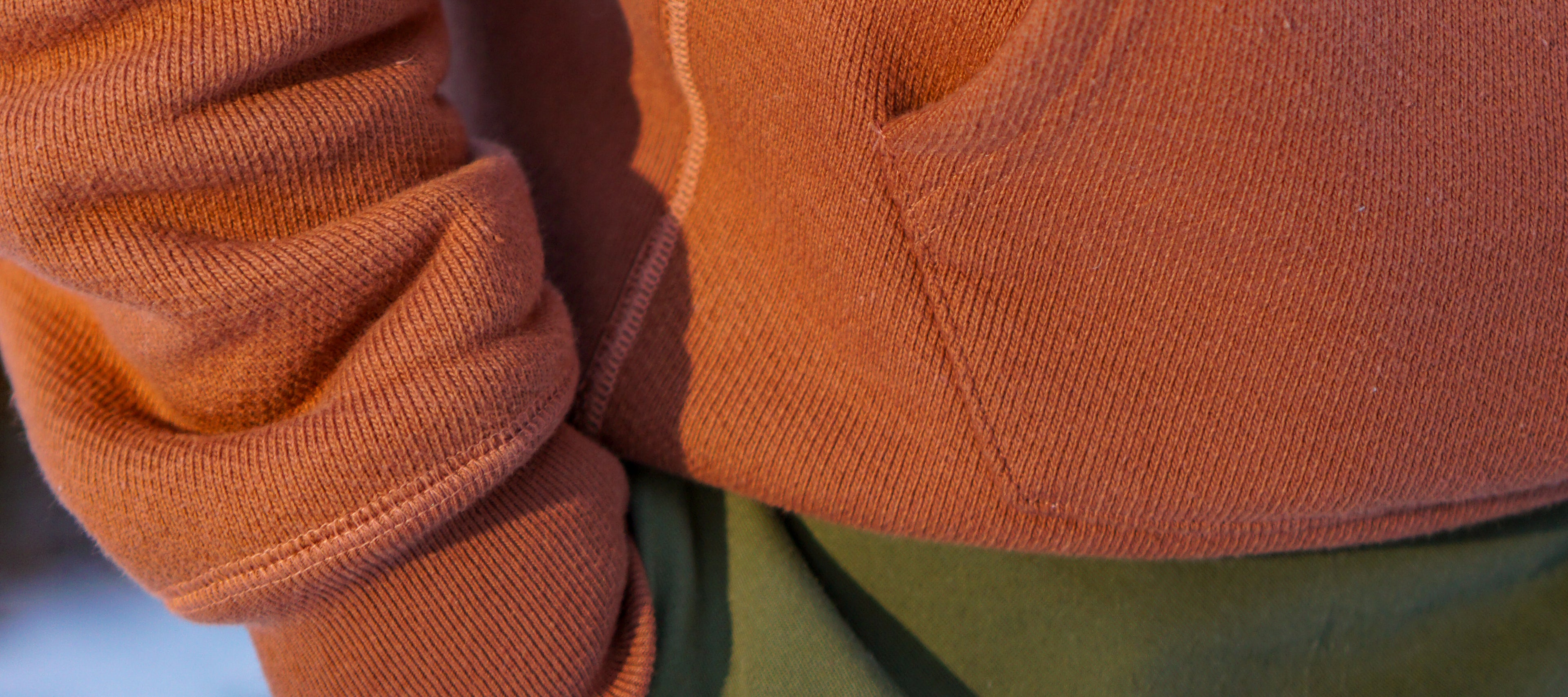 Recycled Cotton on the outside, naturally colored brown cotton on the inside.